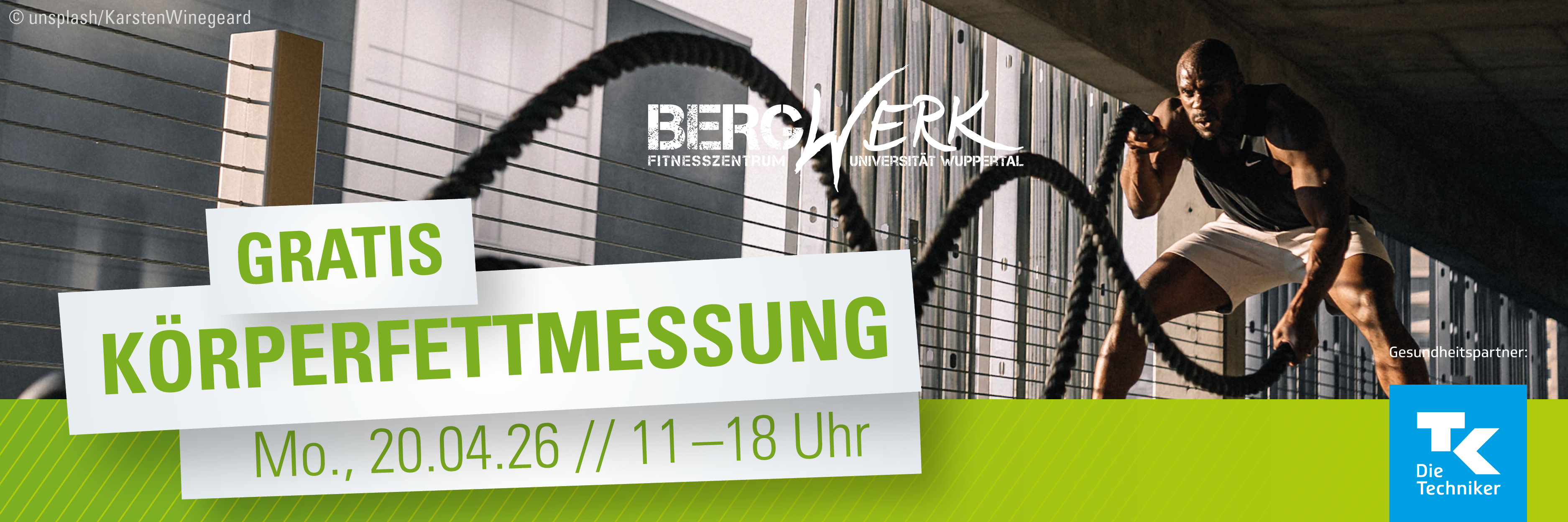 Das Fitnesszentrum BergWerk und der Gesundheitspartner Techniker Krankenkasse bieten am Montag, den 20.04.2026 von 11:00 - 18:00 Uhr für alle Studierenden und Beschäftigten der BUW eine kostenfreie Körperfettmessung an.